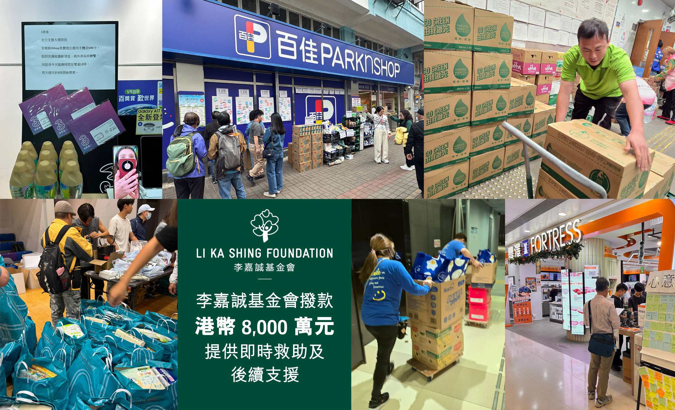 大埔宏福苑火災傷亡慘重,摧毀數以百計家庭,令人悲痛。長和集團旗下業務迅速調配資源,盡力提供支援。香港屈臣氏、百佳、豐澤及屈臣氏蒸餾水向災民送上物資,並設立「關愛服務站」,以及捐贈家電、日用品、個人護理用品等,助災民入住過渡房屋。和記電訊 3Shop 則免費提供備用手機、SIM 卡、流動充電器及 5G 流動寬頻服務。港燈服務隊亦到現場為受影響居民提供支援。李嘉誠基金會即時撥款港幣 3,000 萬元,設立緊急援助基金支援慈善機構提供即時救助,並將撥出額外港幣 5,000 萬元予後續支援計劃。