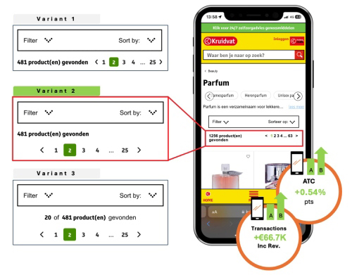 For example, Kruidvat, AS Watsons’ Dutch health and beauty retail chain, found incremental success by optimising the mobile site’s pagination section. Heatmapping data showed that less than 5% of online users were interacting with the feature that allows users to navigate from page to page, which was affecting conversion rates. Kruidvat was able to test three different variants of the pagination section against the original, deciding on Variant 2 as the winner. On paper, the numbers may not seem like much; Variant 2 won, with an increase in “add to cart” and “conversion rates” (+0.54% and +0.01% respectively). That said, this new pagination section led to an impressive €66,749.66 boost in incremental revenue compared to a base group over a short test phase.